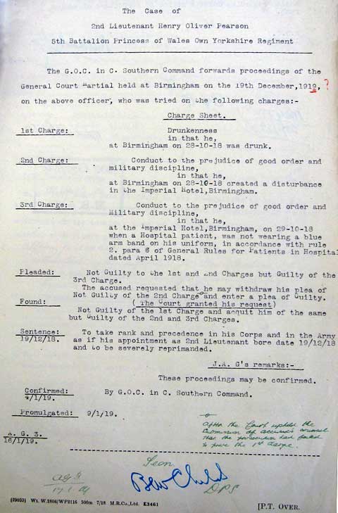 1919 Jan 9. 5th Battalion Yorkshire Regt. 2nd Lt. H. O. Pearson to take rank and precedence in his Corps and in the Army as if his appt. as 2nd Lt. bore date 19th Dec. 1918, by sentence of G.C.M. 9th Jan. 1919