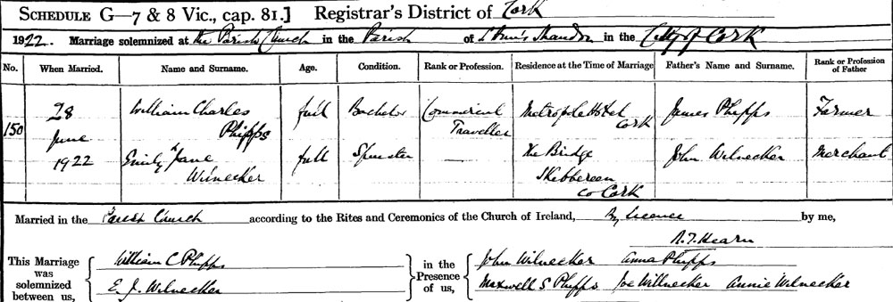 1922 Jun 28. Married in Shandon, Cork to Emily Jane Wilnecker