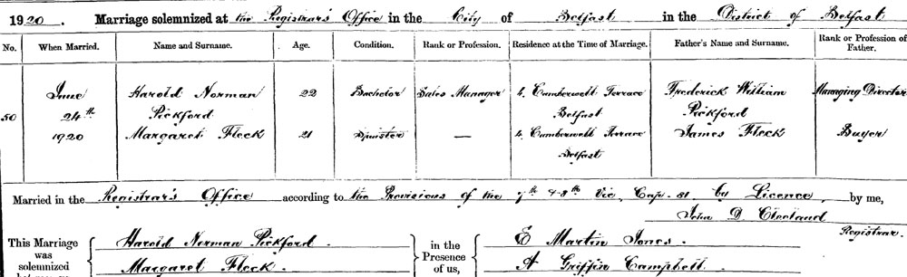 1920 Jun 24. Record Type Civil Marriage Date of Marriage 24 Jun 1920 Groom Name Harold Norman PICKFORD Bride Name Margaret FLECK Church Belfast Civil Registrars Office Parish Shankill Civil District Belfast County Antrim