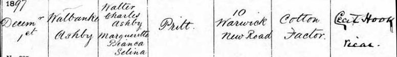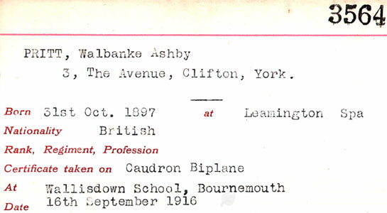1911 census. A boarder at St Olaves, York. His RFC flight records indicate as a civilian he attended St Peter's School in York from September 1909 to February 1916 and then attended the Civilian School of Flight from March–September 1916. Walbanke passed his entrance exams for Sandhurst in February 1916 but was rejected as being too small.