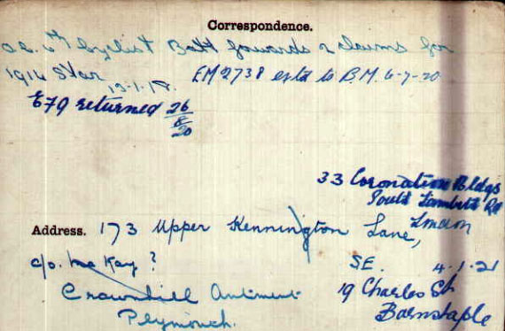 1920 Jul/Sep Married in Plymouth to Gertrude L Huxtable (she married as Gertrude L Ingerson in Oct/Dec 1916 to Ronald G Huxtable in Barnstable, he died in 1917). His sister Maude Selina Rawlings ( born in Dublin about December 1897), married at St Anne's, South Lambeth on 25 August 1920, giving her home address as 33 Coronation Buildings, and Charles Henry Rawlings, Clerk as her father. One of the Charles Henrys signed as witness.