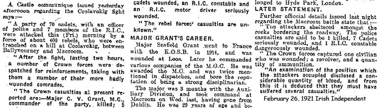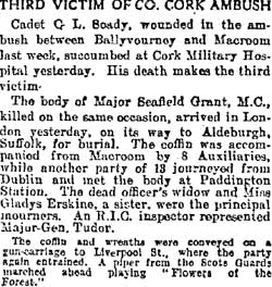 1921 Feb 25. Killed at Macroom in Coolavohig Ambush . A Daily Mail report says that he had only been in Cork 3 days