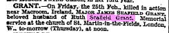 Major Grant’s body arrived back in London the following Tuesday and he was buried in St Peter and St Paul’s Parish Church, Aldeburgh, Suffolk. His widow placed a series of memorials to him in the Times. The inscription on his headstone reads: