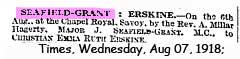 1918 Aug 7. Marries Christian Emma Ruth Erskine