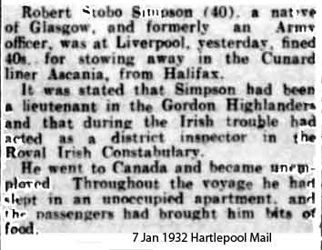1932 Jan 7. Fined for stowing away on a Cunard ship to get back to UK from Canada