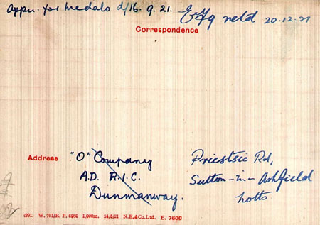 1921 Sep 16 Applies for medals from ADRIC address at Dunmanway