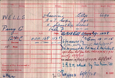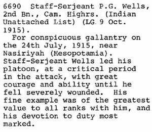 1915 Nov 19 Commissioned 2nd Lt. Staff Serjeant Percy George Wells, from Unattached List, Indian Army (late The Queen's Own Cameron Highlanders), to be Second Lieutenant.