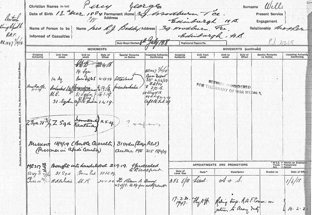 1917 May 1 —Ox & Bucks reports. 2nd Lieut. P. G. Wells proceeded to Basra on transfer to the Royal Flying Corps in Egypt.