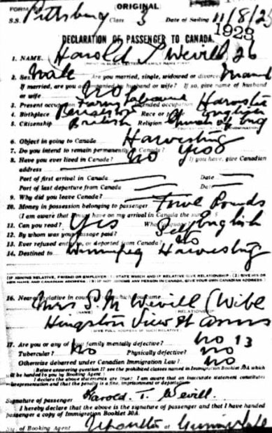 1923 Aug 11. Arrives Canada from UK. He is a Farm Labourer aged 26