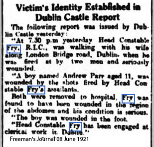 1921 Apr 14 Trial of WL King for the Drumcondra Murders . Lt Commander Fry of the Police Advisors Office was a witness. Circumstantial evidence points to Lt Commander Fry being DI3 AG Fry