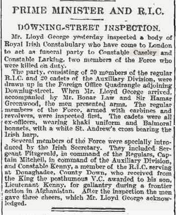The remains of 2 RIC Constables , Caseley and Larking , were accompanied to London by an escort of 20 RIC men and twenty men from ADRIC. The Times carried a report
