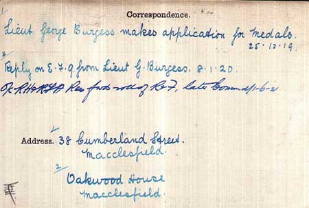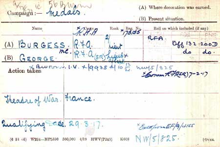 1918 Sep 13. MC gazetted "2nd Lt. George Burgess, R.F.A., Spec . Res. For conspicuous gallantry and devotion to duty. For two days this officer manned an observation post in full view of the enemy and under heavy shell fire, one of his signallers being killed, the information he sent back to the guns being of great value. He had previously, at a critical moment,"when the enemy had broken the line, pushed forward in front of the retiring infantry to get information as to the amount of time there was to spare for getting the guns away, and then attempted to save the telephone, stores, etc., under heavy machine-gun fire. On another occasion he went out under shell fire to the front line to gain information of the progress of the enemy attack.