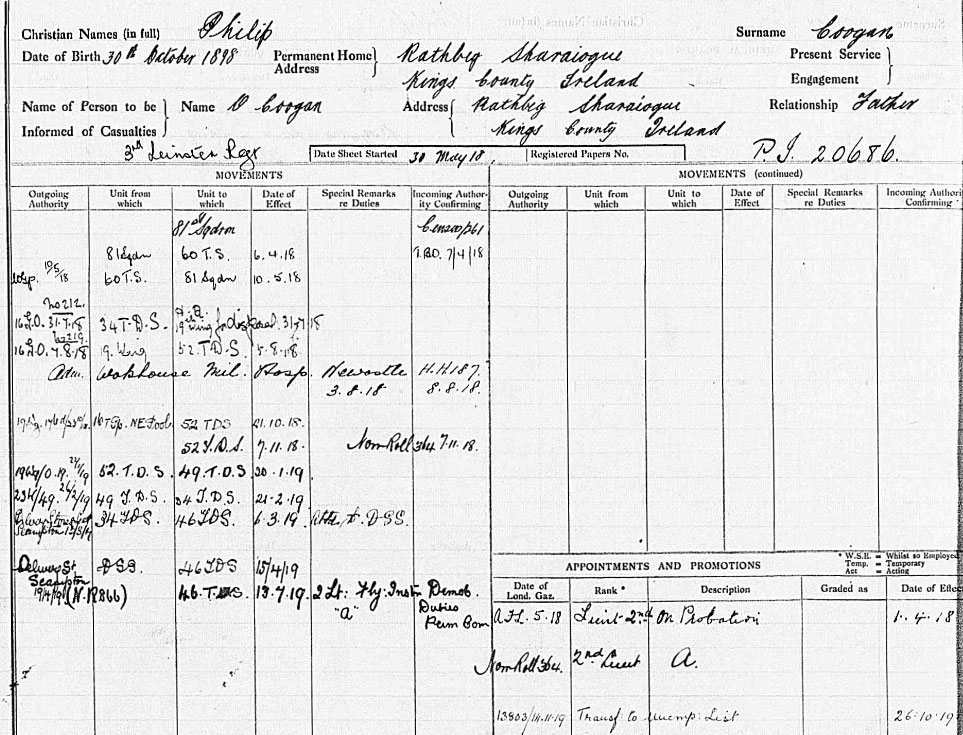 1917 Nov 8. RFC. The undermentioned Cadets to be temp..2nd Lts. (on prob.). Philip Coogan. His RAF Papers show he had been a Private in 3rd Leinster Regt
