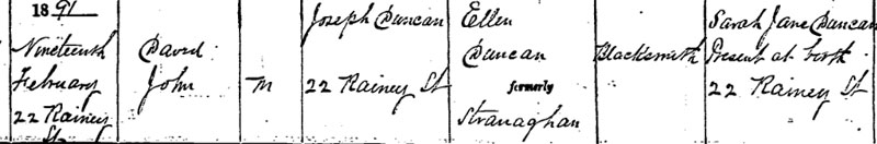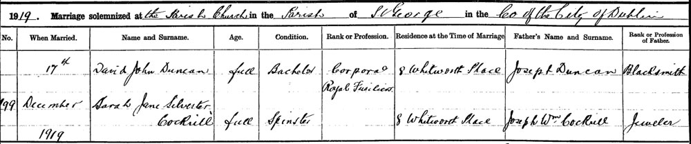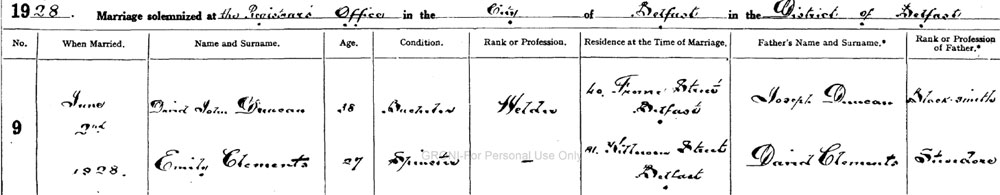 1928 Jun 2 David John Duncan (welder aged 38) married an Emily Clements at Belfast RO. His father Joseph was a blacksmith.