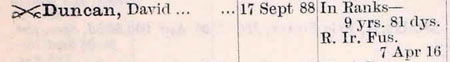 1916 Apr 7 . The undermentioned Wt. and N.C.O.'s to be 2nd Lts. for service in the Field. R. Ir. Fus. Co. Qr.-Mr.-Serjt. David Duncan, from R. Ir. Rif.