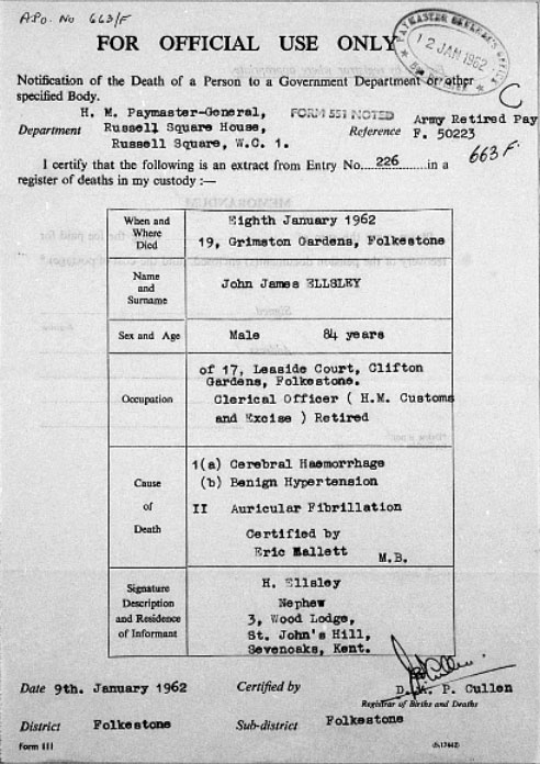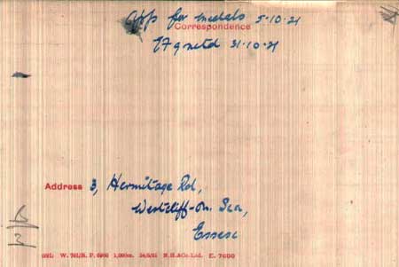 1939 Register living at 3 Hermitage , Southend-on-Sea C.B., Essex, England with his wife Florence He is a Customs & Excise Clerk