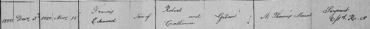 Transcribed as F R G Gibson in Numeric Register, with FE apparently added above the line. FPG Gibson in Alphabetic Register, with a faint alteration to make it "FEG". .The Leave Book has him as "F E Gibson with "age 40". There is a Francis Edward Gibson MBE, but he is the wrong age (born 1897)