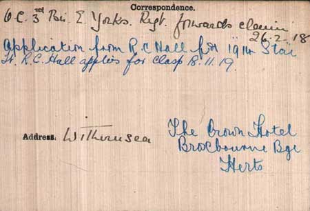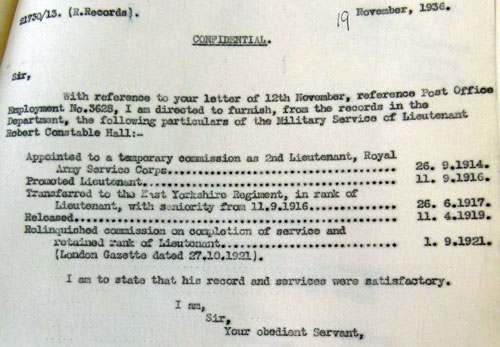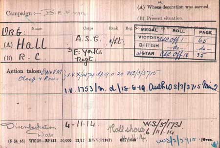 1921 Oct 27. Gazetted out of the army. E. York. R. Temp. Lts. : — R. C. Hall, and retains the rank of Lt