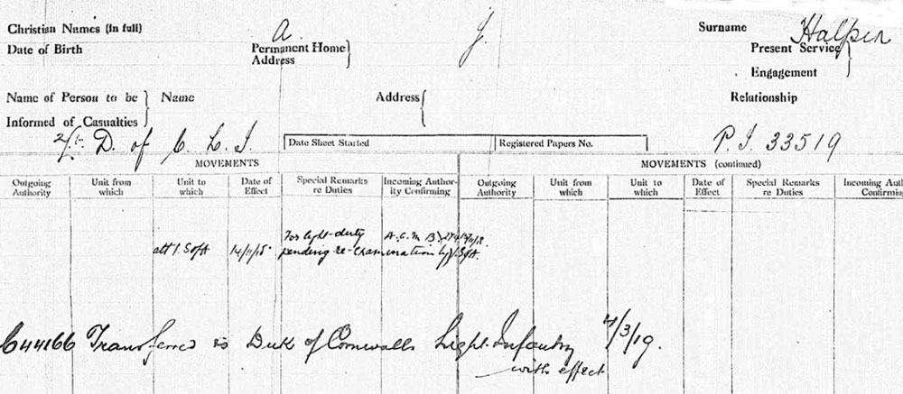 1918 May 1. Commissioned 2nd Lt . DCLI. A. J. Halpin.
