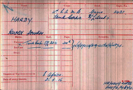 His military career started as a gunner in the highly mobile 4th Light Armoured Motor Battery, which joined the British East Africa Expeditionary Force, under the command of General Jan Smuts. The Tempest's Annual for 1916 describes him as "Gunner, Hardy, Harold D, Motor Machine Gun (Company). From Seatown Place, Dundalk." He probably received his training at the Motor Machine Gun Training Centre at Bisley Camp, Surrey, which lasted four months. As a gunner, he would certainly have received instruction and practice in firing the Vickers 303 machine gun. In addition, to basic training and fitness, he would have received driving lessons, tactical training, and ASC tuition in car maintenance.