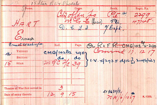 1920 Feb 24. D. of Corn. L.I. Temp. Lt. E. W. Hart relinquishes his commission on completion of service, and retains the rank of Lt