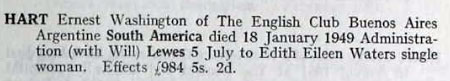 1949 Jan 18. His probate record shows- Ernest Washington Hart of the English Club Buenos Aires Argentina South America died with will to Edith Eileen WATERS single woman £984 5s 2d. She is in fact Edith Eileen Bates who married Noel Rylance Fletcher Waters on 9 August 1928. She had gone to Buenos Aires with her husband and 2 children in 1937.