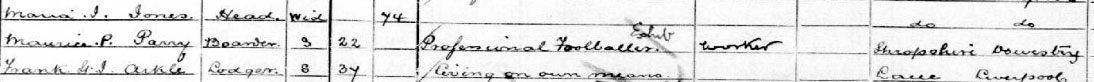 1901 census at 27, Arkles Road, Liverpool, Walton on the Hill, West Derby, Lancashire. He is a professional footballer