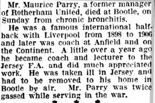1935 Mar 24 Died at Bootle The death occurred during the week-end of Mr. Maurice Parry, many times Welsh international wing half-back, one-time manager of Rotherham Town and coach to Liverpool F.C. until two years ago. He was one of a noted line of half-backs for Liverpool when Alex Raisbeck was in his prime as captain of the team. (Yorkshire Post and Leeds Intelligencer, 26-03-1935)