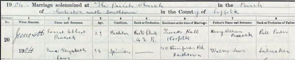 1904 Jun 3 • married at Tivetshall St Mary and St Margaret, Norfolk, England to Emma Elizabeth Laws (1879–1953)