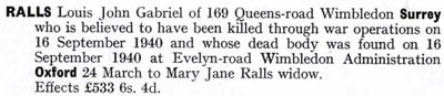 1940 Sep 6. Died in German bombing raid. Of 169 Queen's Road. Son of Mrs. Ralls, of 253 South Park Road; husband of Doris Augusta Ralls. Died at 51 Evelyn Road.