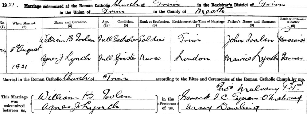 1921 Aug 8. Married in Trim to Agnes J Lynch. Note G Tynan O'Mahony was a witness. He describes himself as a soldier rather than ADRIC