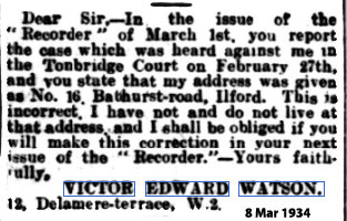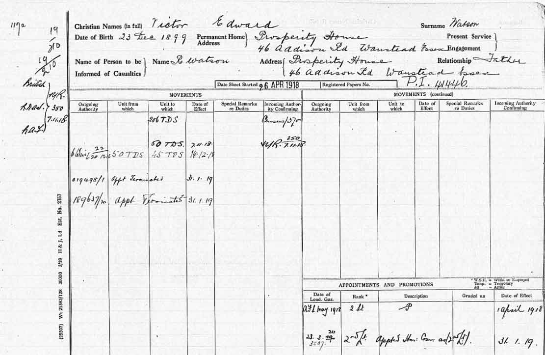 1920 May 11. He married Violet Adelaide Parks at St. John’s, Leytonstone. Their only child, a son, Maurice. Watson, was born on 23rd December 1920. The marriage was not a happy one and in 1925 Violet petitioned against him for divorce, although this was later withdrawn. Violet Cullingford remarried for a third and final time to Frederick Henry Thomas Torode (1902-?) at St. Katherine Cree, in the City, on 23rd December 1928-described on the marriage certificate as “Single and Unmarried”. The son of her marriage to Victor Watson, Maurice Watson, assumed the new family surname of Torode when his mother remarried Frederick Torode in 1928 and became known as Jim. With the Second World War, Jim Torode joined the Royal Air Force Volunteer Reserve. As Sergeant James Torode, RAFVR, he was killed in action on 10th April 1944 as a Flight Engineer with the loss of his Avro Lancaster of 576 Squadron– along with all his crewmates- shot down by a German night fighter while returning from a raid on the railway marshalling yards at Aulnoye, France, part of the bombing campaign against the French railway system in the build-up to D-Day.