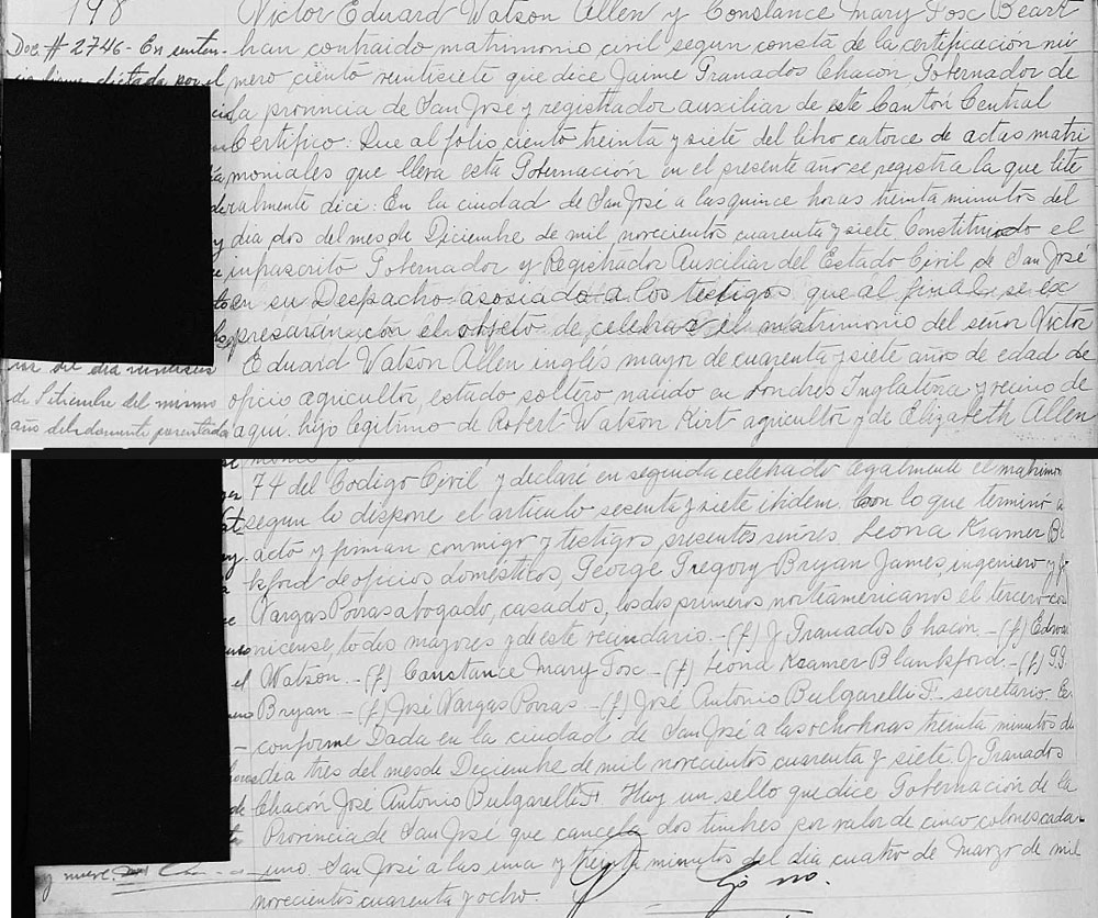 1947 Dec 2 . He marrries in Costa Rica to Constance Mary Fosc Beart . The certificate uses the Spanish naming system. His mother was Elizabeth Allen, and his fathers mother would have been Kirl