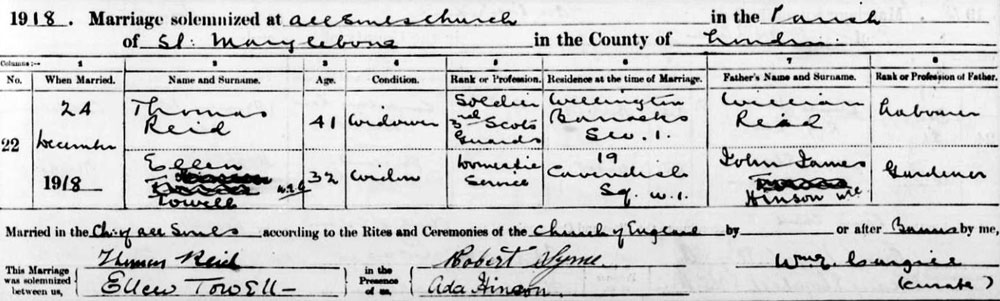 1914 Aug 26, Enlisted Scots Guards. wife Catherine at 56 Cullercoats St, Welbeck Rd, Byker, Northumberland