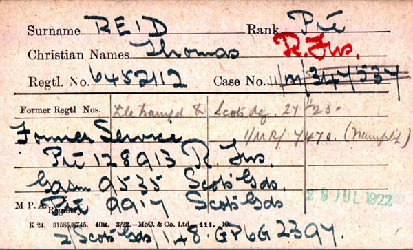 1919 Feb 8. Discharged from Scots Guards. Re-enlisted