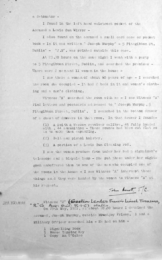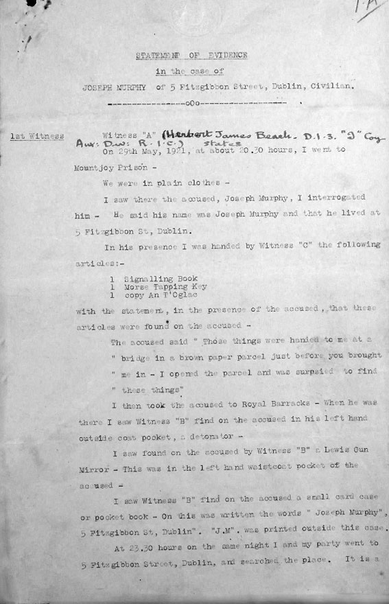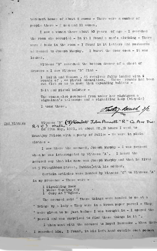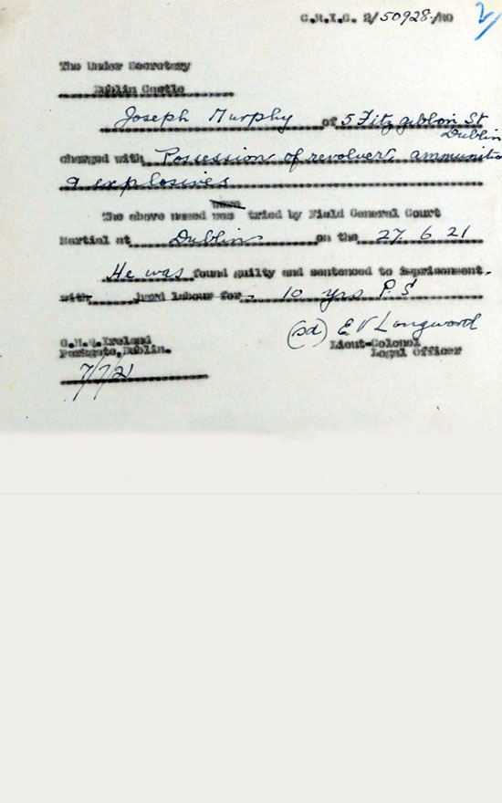 Joseph Murphy of 5 Fitzgibbon St was arrested at about 20.00 just outside Mountjoy Prison and interrogated first in Mountjoy Prison on 29 May 1921, where he had been first taken, then at Royal Barracks. Murphy had on his person a number of incriminating articles, which led to his address being searched. His lodgings yieldedd a revolver and other arms