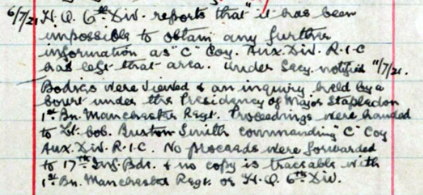 One body was never found, and strangely enough it was the Guthrie who had blown the gaff on the Chichester affair, and had stopped his fellow Auxiliaries from trying Chichester. Gutherie had been in the second tender with Forde who believed that he saw him trying to get across the bog to gain cover behind some of the heavy rocks, but that he had been sucked down by the soft unstable bogland and had drowned.