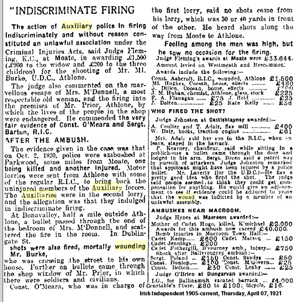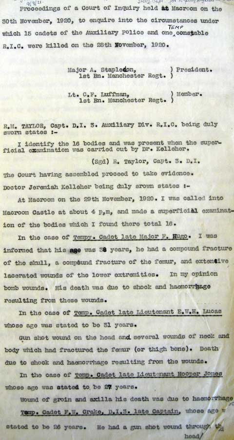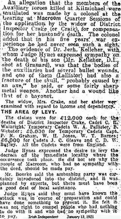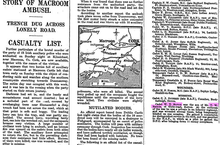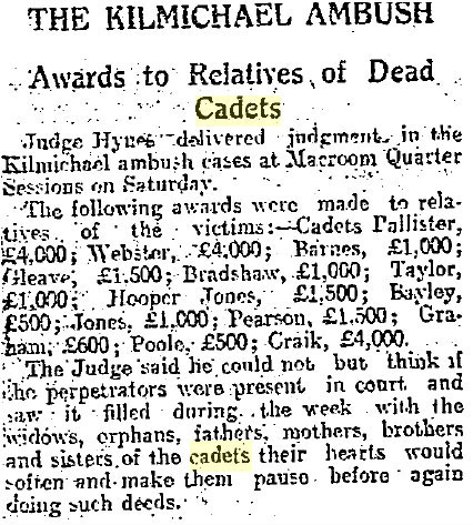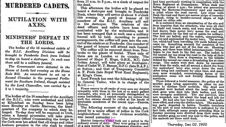 16 Auxiliaries now were dead and two badly injured. One of the injured, Frederick Henry Forde in fact had survived, though shot in the head and left for dead by the IRA. He was picked up by the British the following day and taken to hospital in Cork. The other survivor, Cadet Cecil Guthrie (ex Royal Air Force),was badly wounded but somehow escaped from the ambush site - it is not clear when he escaped. However he eventually got to within 2 miles of the Auxiliary Barracks at Macroom, before he was found and shot, apparently with his own gun, his body dumped in Annahala bog. In 1926, Guthrie's remains were disinterred after various negotiations locally and handed over to the Church of Ireland for a Christian burial at the Inchigeelagh Churchyard..