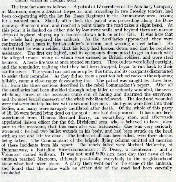 .2. Murphy queries Barry's account of the attack on the first Auxiliary lorry. "A more plausible view would suggest the ADRIC were stunned by the opening fusillade and put up little or no resistance. They would have had good hopes of being treated well because only a month before, on October 22, a patrol of the Essex regiment which surrendered had their weapons and ammunition confiscated but were sent on their way unharmed." He is skeptical about Barry's account of the action at the second lorry: "A more credible account would be that the ADRIC members at the second lorry also surrendered following an initial exchange of revolver fire. The specifics of the injuries and the subsequent location of the bodies would support a theory that they were surrounded while shot."