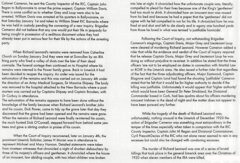 1920 Dec 30. Captain W Davis was identified, in a British Court of Inquiry, as the man who shot Richard Leonard at Boskill near Caherconlish. Charges against Davies were later dropped but his guilt was clearly established. The two other army officers with him were Major William Grey and Lt G. M. Loup.