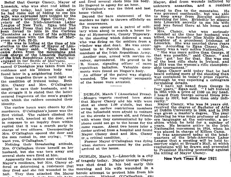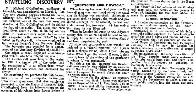 In 1932, Brigadier-General F. P. Crozier, a former commandant of the Auxiliaries, in his book Ireland Forever, stated that after he carried out a personal investigation of the murders in March 1921 he had come to the same conclusion as Mrs. O'Callaghan, that is, that her husband 'was murdered by police, acting under orders, as part of a plan to 'do away with' Sinn Fein leaders, and put the blame on Sinn Fein