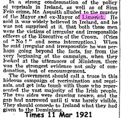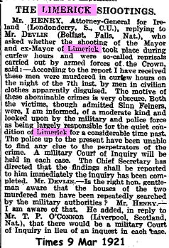 A number of British Officers and Auxiliaries who operated in the Limerick area were believed to have taken part in after dark murders. These officers included George Montagu Nathan an Auxiliary, formerly of the Warwickshire Regiment, Captain William Davis of the Machine Gun Corps (Davis was certainly a army not Auxiliary officer), Lieutenant Leslie Ibbotson also an Auxiliary and formerly of the Leicester Regiment. Nathan was implicated in the shooting of Tom Blake on the Clyde Road in early 1921. Both Nathan and Ibbotson were believed to have taken part in the murder of the two mayors of Limerick in March 1921.