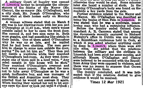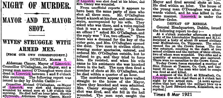 RIC men who were known or strongly suspected of having taken part in murders in the Limerick region were Sergeant William Leech, Sergeant James Horan and Sergeant Eugene Igoe. Leech was identified as having led the squad of men who murdered Joseph O'Donoghue on the same night that George Clancy and Michael O'Callaghan were murdered. William Leech was later shot dead at Westland Row railway station in Dublin during the Truce.