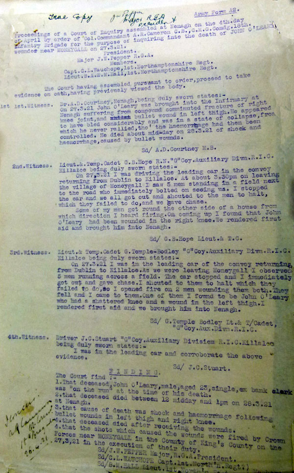 1921 Mar 27. T/Cadet GB Hope, T/Cadet GT Bodley and Driver JC Stuart were in the leading car of a convoy. They saw 5 men in a field outside Moneygall. The men ran, and were fired upon by the ADRIC. One of them, John O'Leary, was hit, and died in hospital in Nenagh. The inquest states that John O'Leary was "on the run" at the time of his death. The men were from G Coy