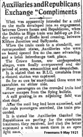 There were a number of Auxiliaries on the train, who opened fire on their ambushers. The IRA claim that after a brisk exchange 11 Auxiliaries and 2 police surrendered and arms, ammunition and mail was taken. The County Inspector's report says 5 Auxiliaries returning to Tubbercurry and one Ballymote constable were deprived of their arms. Passengers were said to have had narrow escapes and a calf grazing in a nearby field was killed.
