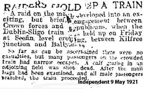 1921 May 6. The Dublin to Sligo train was held up at Seefin level crossing between Kilfree Junction and Ballymote at 7.30 pm to raid the mails. A man with a red flag stopped the train.