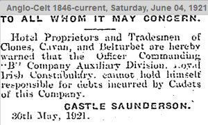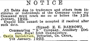 1921 May 30. Announcement in Anglo-Celt warning local tradesmen that the ADRIC is not responsible for individual debts in Belturbet, Clones, Cavan. It is signed Commanding officer of B Coy at Castle Saunderson.