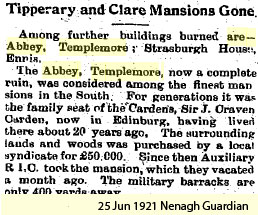 1921 Jun 19. Templemore Abbey burnt by IRA - compensation was later awarded to the owners of £35,000. A Witness Statement gives Commandant Séan Scott of the local IRA received a message from Michael Collins informing him that B company were about to vacate the mansion of Sir John Carden at Templemore Abbey, which they had commandeered in 1920. Collins directed that Templemore Abbey should be destroyed at all costs, ‘even at the loss of men’. Scott was surprised to learn that the Abbey was to be vacated as he had received no local intelligence to that effect. However, because of the implicit confidence which he had in Collins preparations were made to burn the mansion. The Abbey had been turned into a formidable HQ by ADRIC and was also an important symbolic target for the local IRA. as it was the former residence of the Carden family, notoriously unpopular landlords in the Templemore area. Scott was correct to have faith in the information supplied by Collins as shortly after the intelligence was received, and much to the relief of the I.R.A the Auxies were observed loading their lorries and leaving the Abbey. That night a party of fifteen IRA men collected thirty gallons of petrol from various premises in the area and broke into the mansion. The premises were set ablaze with some Volunteers receiving injuries in the process. Within a few hours the entire premises had been razed to the ground’. All that remains today of the Abbey are some of the outbuildings and the gate lodge.