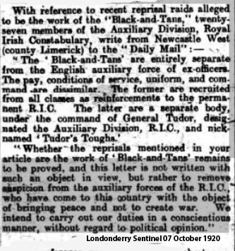 1920 Oct 7 . A Group of 27 Auxiliaries - that is one Platoon - write to the Daily Mail from Newcastle West.