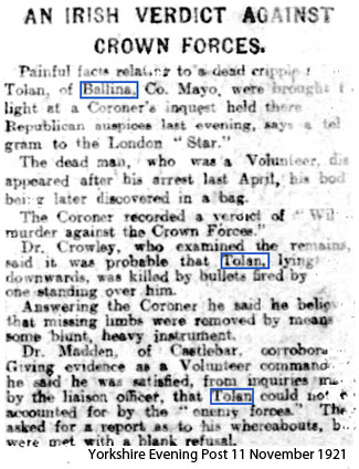 1921 May 7. Michael Tolan, was arrested on 18 April 1921 in county Mayo. He was detained in Ballina barracks until 7 May 1921, when he was handed over to Auxiliaries of D Company ADRIC, for transportation to Galway. The Auxiliaries made it back safely that night-without their prisoner. When a member of Dail Eireann inquired into Tolan's disappearance after the Truce of 11 July, he was told: "I am informed by my Authorities that owing to the transfer & absence on sick leave of some of the members of the Auxiliary police force who are concerned in this case it has not been possible as yet to complete inquiries into the matter." Later, the missing man's comrades learned that a badly decomposed body had been found about a week after Tolan disappeared, in a bog near Ballina. The remains had been taken to nearby League and buried in a plot marked "unknown."